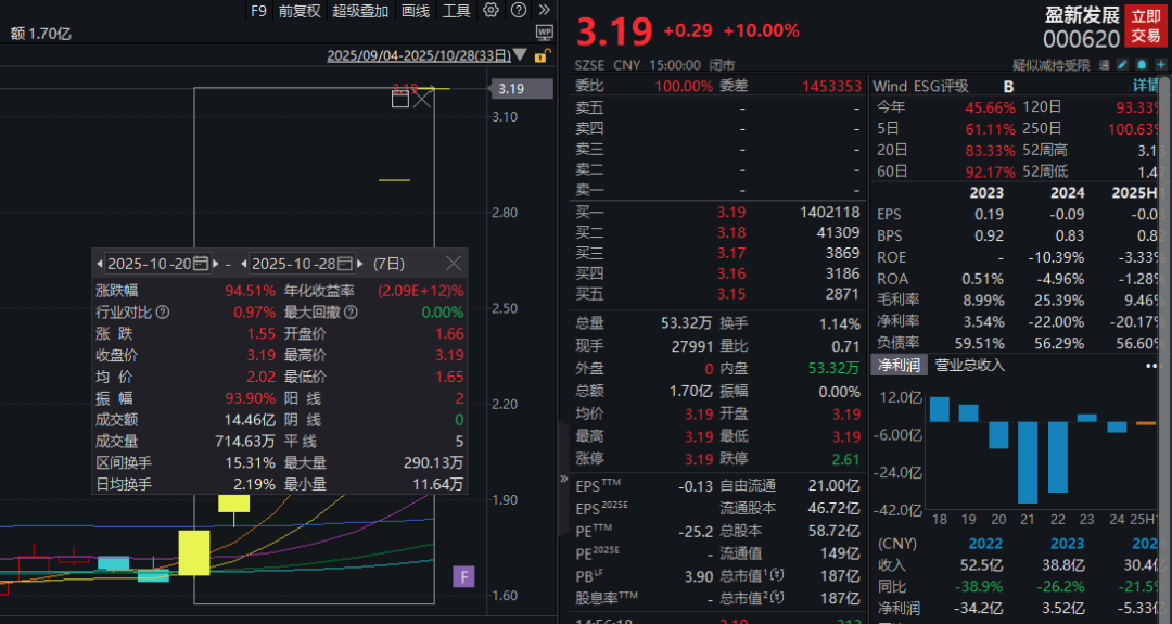 Wind数据显示,7个交易日内,盈新发展股价累计上涨94.51%,其间Wind同行业(二级行业)指数上涨0.97%。截至28日收盘,该股股价报3.19元/股,换手率仅有1.14%。