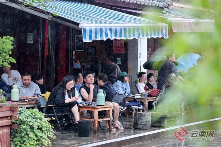在大理巍山古城,“百年茶室”里坐满了品茶听雨的游客,茶香与雨声相伴,惬意悠然。