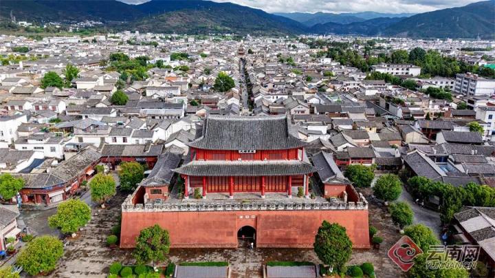 巍山古城雨景,青石板路与古建筑交相辉映。